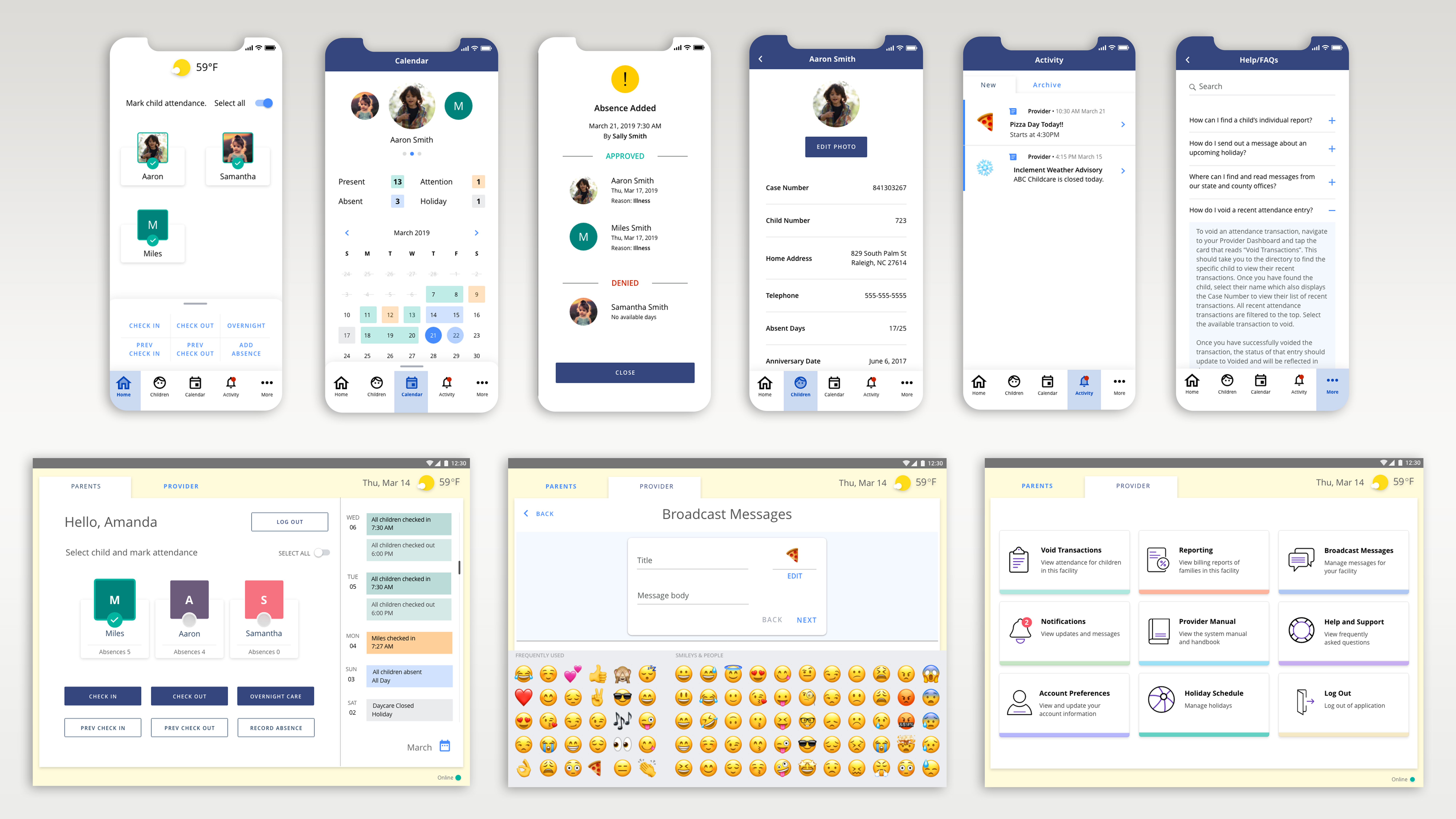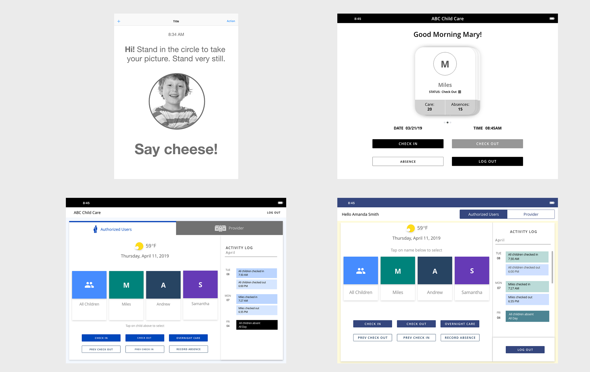 We went through many iterations over the course of this design. Scope and development capabilities impacted some of the ideas of the design features. We initially had an idea to have a beacon check-in system to allow for check-ins to be completed using geolocation or proximity. We also wanted to include a faster way to complete check-ins by having a QR code for easy scanning if the parent needed to physically walk into the location or if there was a scanner in the curbside line. Timelines caused this version of the app to be put in the backlog and we needed to reimagine another way to cover transactions in the first release. We eventually came to a solution to allow parents to use the mobile app to select children for attendance and complete the check-ins. If the parents forgot their phone or didn't have one, we designed the tablet/kiosk app to allow them to still complete attendance manually.
